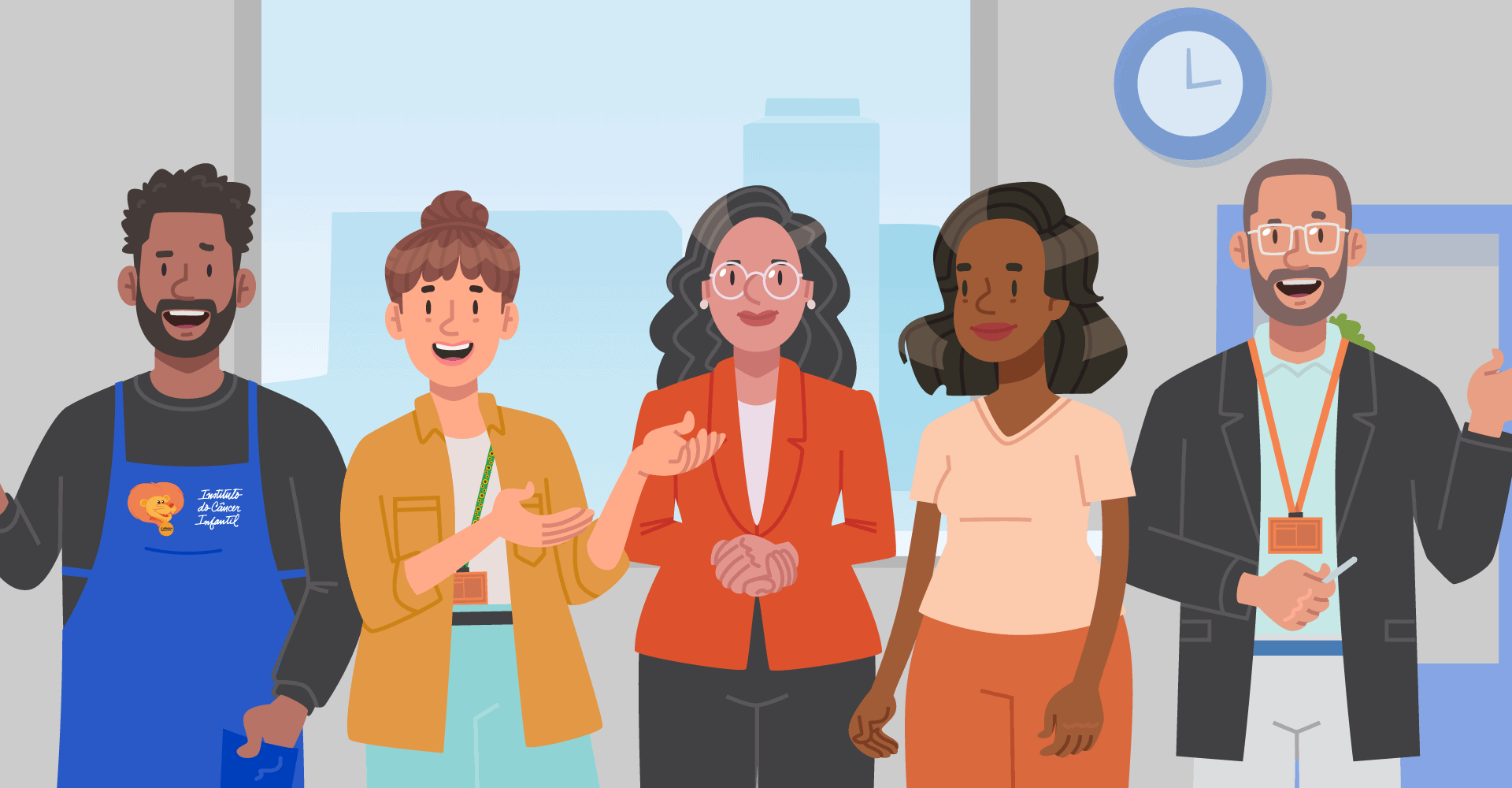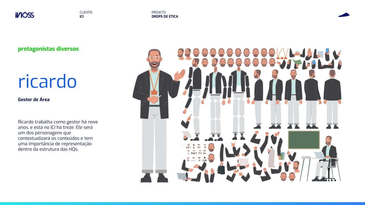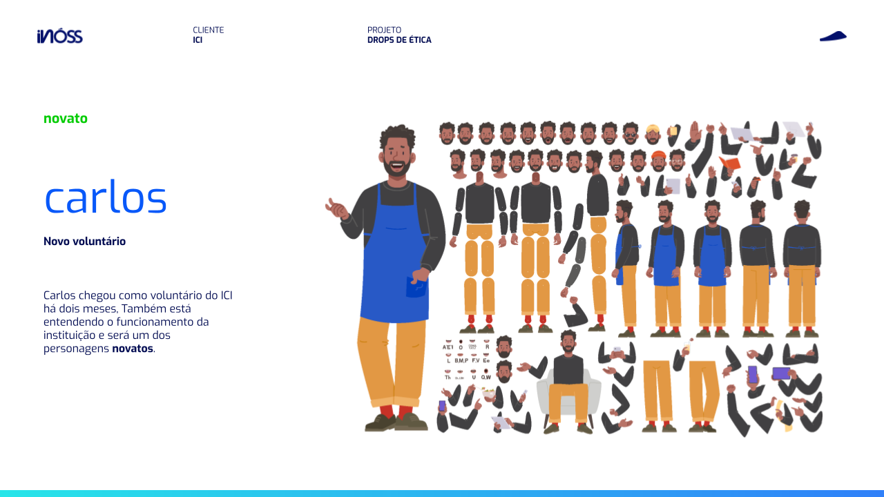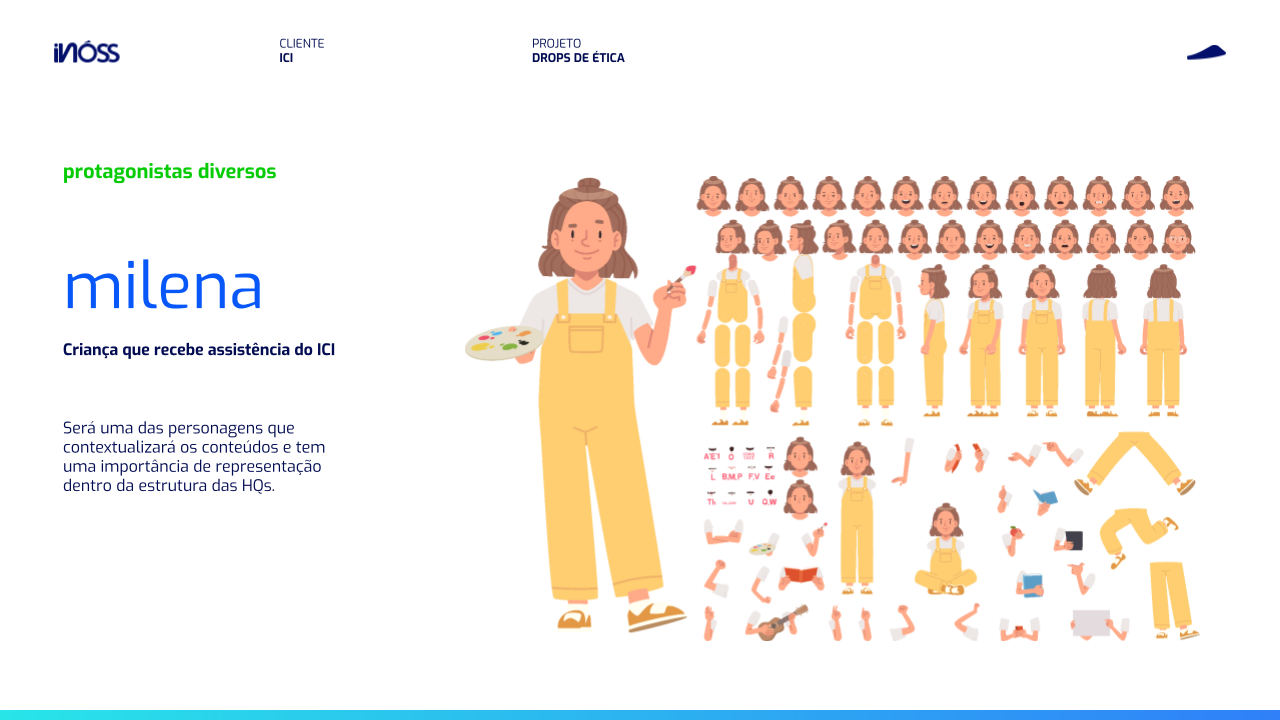 Desenvolvemos personagens que refletissem as diferentes pessoas que fazem parte da instituição: lideranças, colaboradores, voluntários e crianças beneficiadas, em diferentes etapas das suas jornadas com o ICI, para refletir como o Código faz parte da vida de cada um e a sua importância para fazer a diferença na vida dos pacientes.